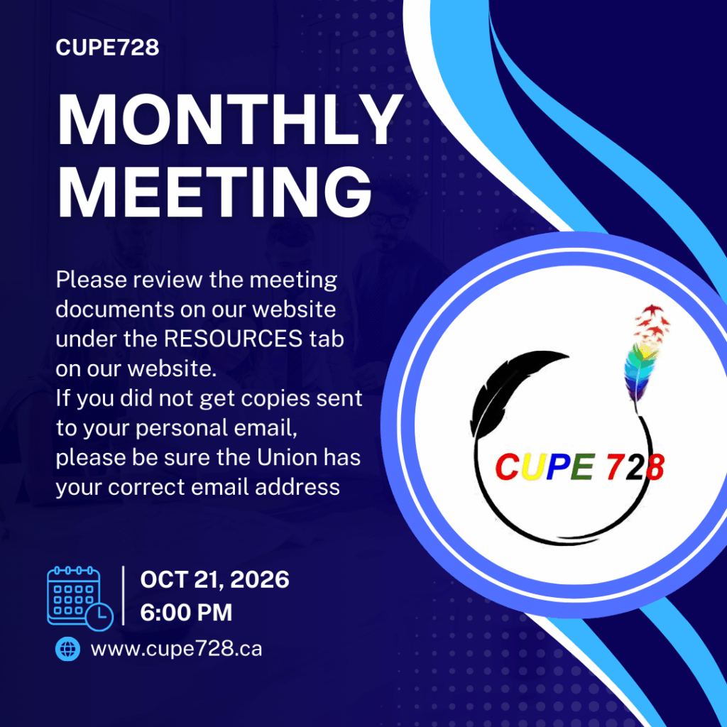 This meeting will be in-person at our Union Office (#209 – 6678 152nd Street, Surrey BC V3S 7J2) or on-line using Zoom. The registration for the meeting will be sent out through the Chronicle Newsletter and to your personal email address (we cannot use your work email). If you have changed your personal email address or have not sent it to the Union, please email office@cupe728.ca or commofficer@cupe728.ca