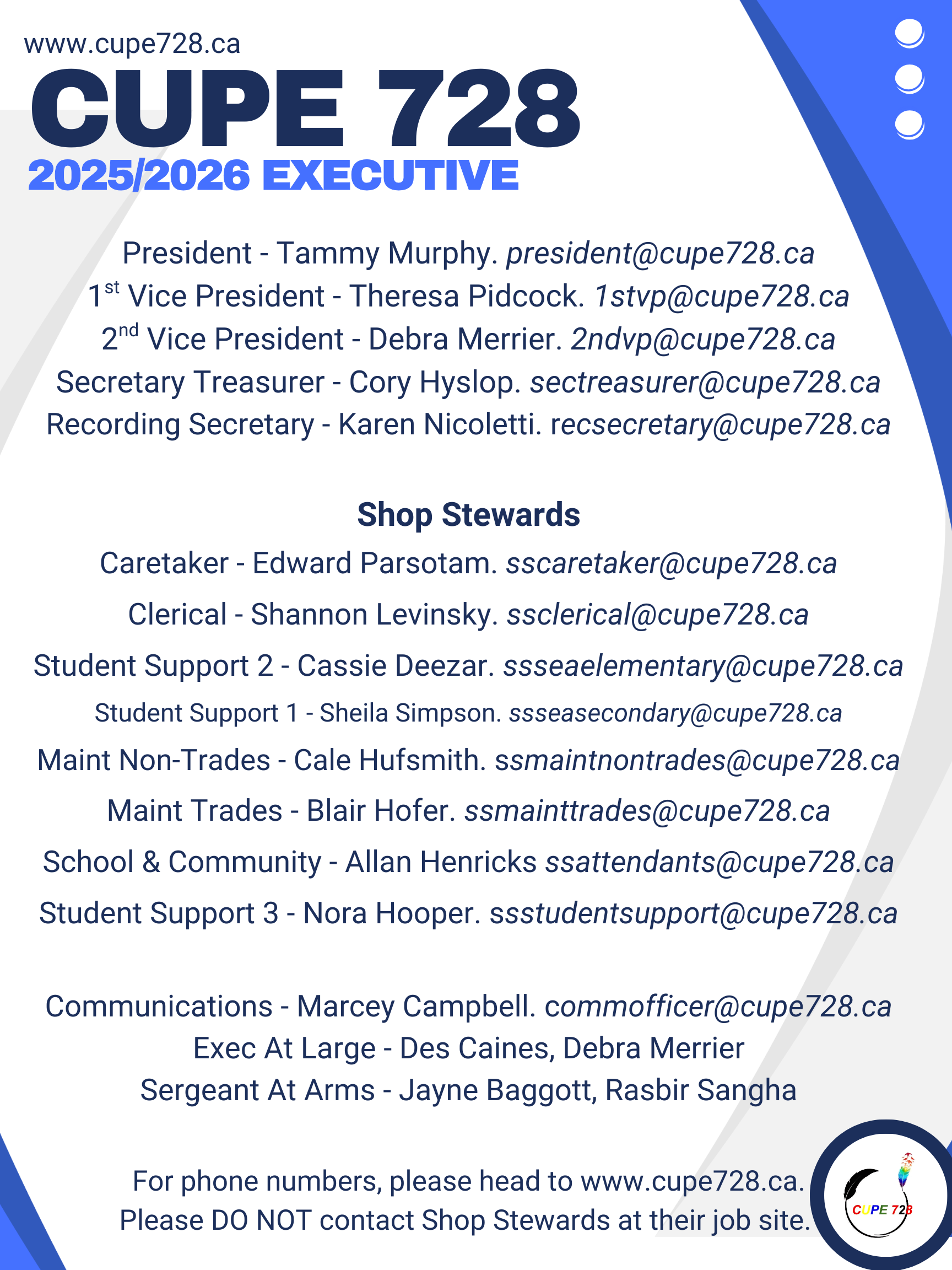 Did you know that it is mandatory to have a spot for CUPE728 information to be put up at EACH worksite? If your worksite doesn’t, please reach out to your Shop Steward and your Manager/Supervisor/Admin. If you’re not sure what it could look like, here are some amazing CUPE728 board you can get ideas from (check the bottom on the page). Information that should be on each board is listed below. You can have them printed off at your worksite and put them up.